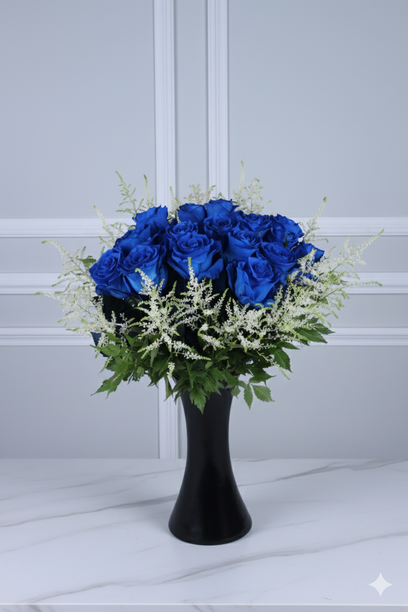 Mavi gülün asaletini ve zarafetini bir arada sunan bu özel aranjman, modern siyah vazo içinde hazırlanmıştır. Eşsiz görünümüyle bulunduğu ortama şıklık ve huzur katar.