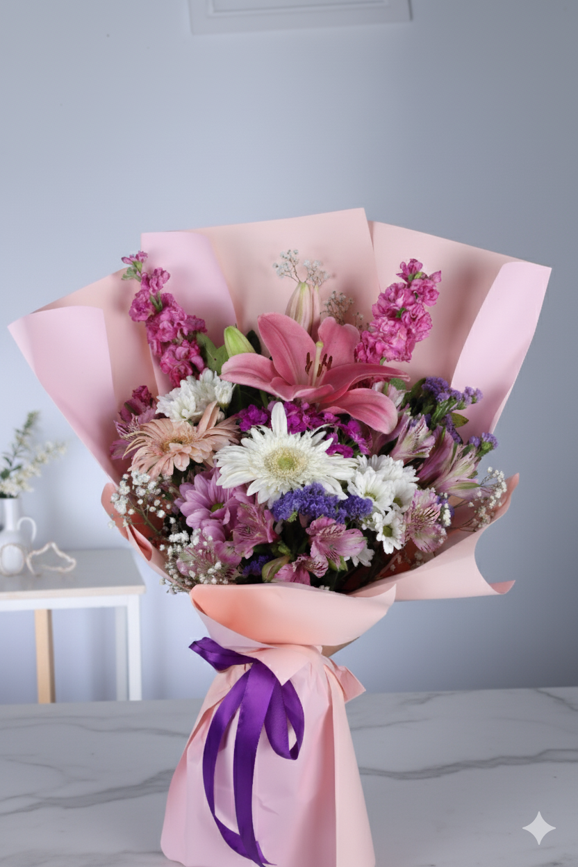 Yumuşak pembe, mor ve beyaz tonların buluştuğu “Asya Çiçek Buketi”, zarifliği ve şıklığı bir arada sunar. Lilyum, papatya, lisyantus, statis ve cipso çiçeklerinden oluşan bu buket, sevdiklerinize hem huzur hem de mutluluk taşıyacak. Pembe ambalajı ve mor kurdelesiyle tamamlanan bu çiçek tasarımı, romantik ve modern tarzı bir arada yansıtır.
